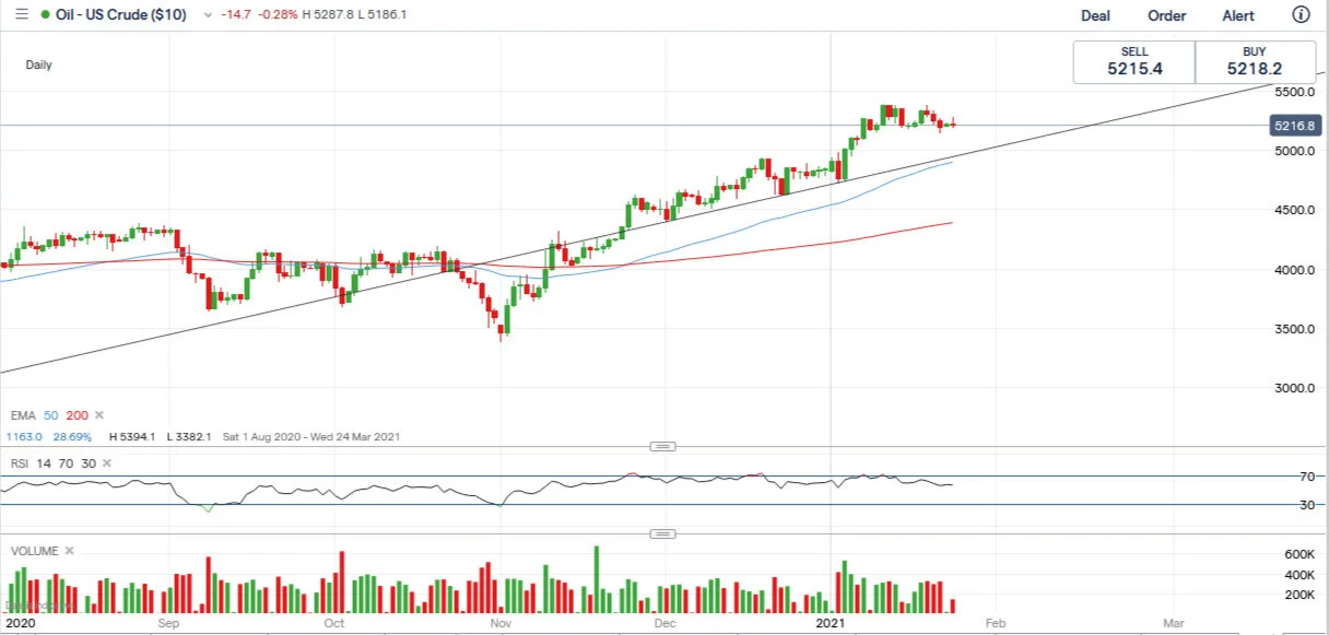 Fundamentally speaking there are a few factors in play that could see the correction bring the price of oil into a value area. First off we have the new covid-19 restrictions being imposed in China just before the Lunar New Year festivities, this could potentially have a big impact on the demand from the worlds largest oil consumer. There was two surprise inventory builds from the US last week showing that once again oil supply is still outpacing the demand and this could see a bearish reversal if this trend continues over the coming weeks. There’s also news that Iraq wasn’t compliant with it’s production quotas in recent months, whilst they have pledged to cut this months production in order to make up for the oversupply, it remains to be seen if Iraq along with many other OPEC+ producers will stick to the production quotas after the Saudis volunteered such a huge cut of 1 million barrels per day. Iran is another country to keep an eye on, with Trump out of office Iran will most likely push their production quotas up in the coming weeks and months. Another development to keep an eye on is the US Shale industry, at these prices it is now profitable to switch on the shale rigs once again, further increasing the supply side of the equation.